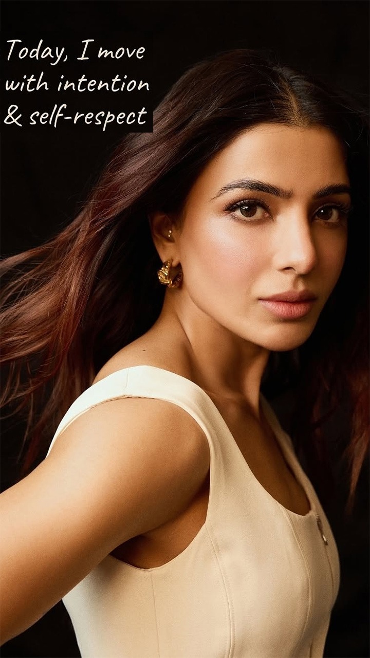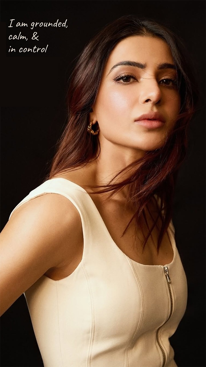 Samantha Ruth Prabhu wears a sleek, cream-colored sleeveless top with a front zipper, which accentuates her modern style. Her loose, wavy hair adds a touch of softness to the overall aesthetic.