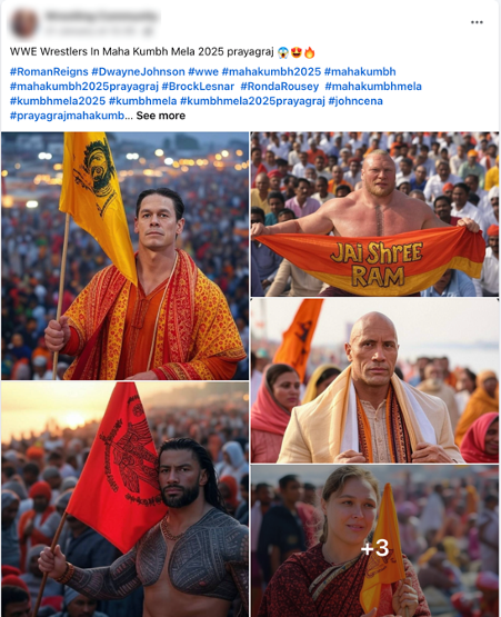 Images (here, here & here) of wrestlers like John Cena, Brock Lesnar, and Dwayne Johnson (Rock) are being circulated, claiming to show them at the Kumbh Mela. However, we have not found any credible reports confirming this matter to date. A reverse image search of the viral images led us to a Facebook page named “Wrestling Community,” where these images were uploaded earlier. The page states that the photos of the wrestlers are AI-generated.