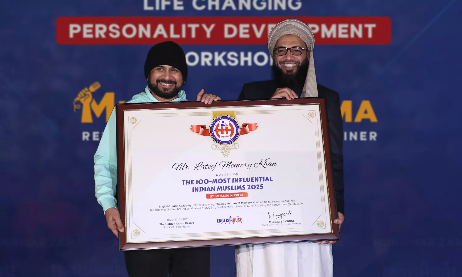 Recently, Munawar Zama felicitated Lateef Khan (Memory Khan) with a memento and congratulated him on being shortlisted among the 100 Most Influential Indian Muslims of 2025, during the farewell ceremony of a one-month residential personality development workshop held at the Hidden Castle Resort, Telangana, attended by nearly 150 students from across India. The event was further enriched when Memory Khan delivered a live demonstration of advanced memory techniques, leaving participants inspired by the power of brain-based learning.