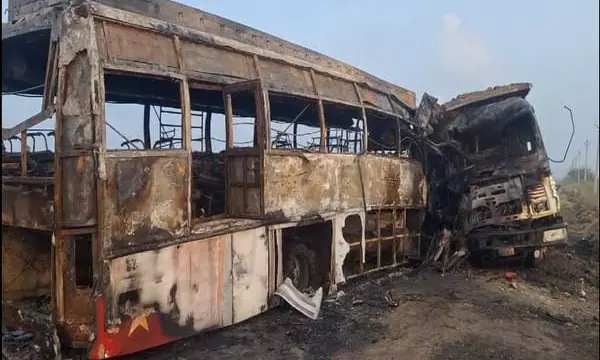 In a tragic incident, five persons charred to death as the bus they were travelling in suddenly caught fire after colliding with a lorry. The mishap occured at Chilakaluripet mandal of Palnadu district. Several others suffered burn injuries, according to reports.