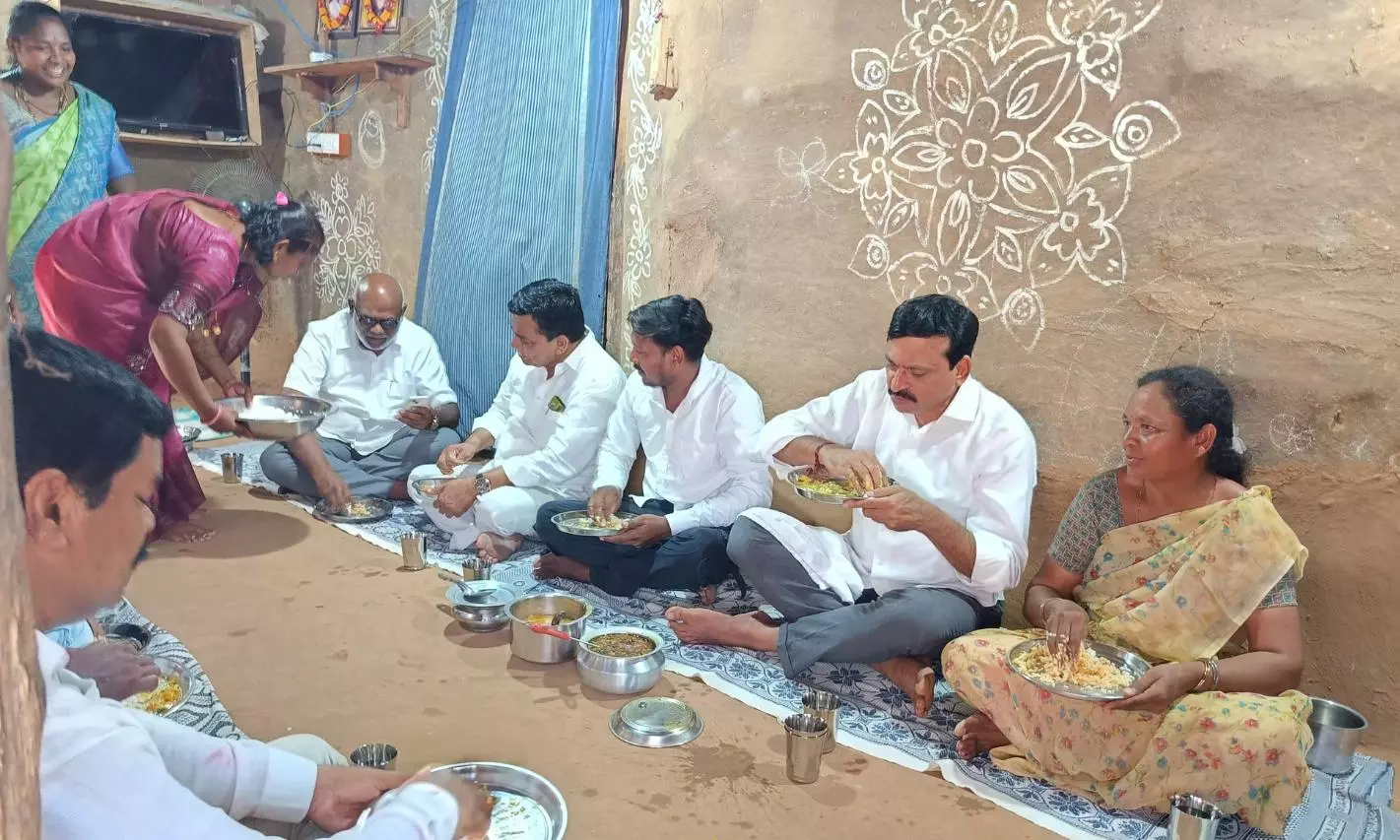 Srinivas Reddy had lunch in the house of a Koya tribal woman Vanka Shiva Lakshmi at Bojjavari Gumpu in Manuguru mandal. The family members served food prepared with fine rice of PDS to the minister. Mahbubabad MP Balram Naik, Pinapaka MLA Payam Venkateshwarlu, district collector Jithesh V. Patil and ITDA project officer Rahul accompanied the minister.