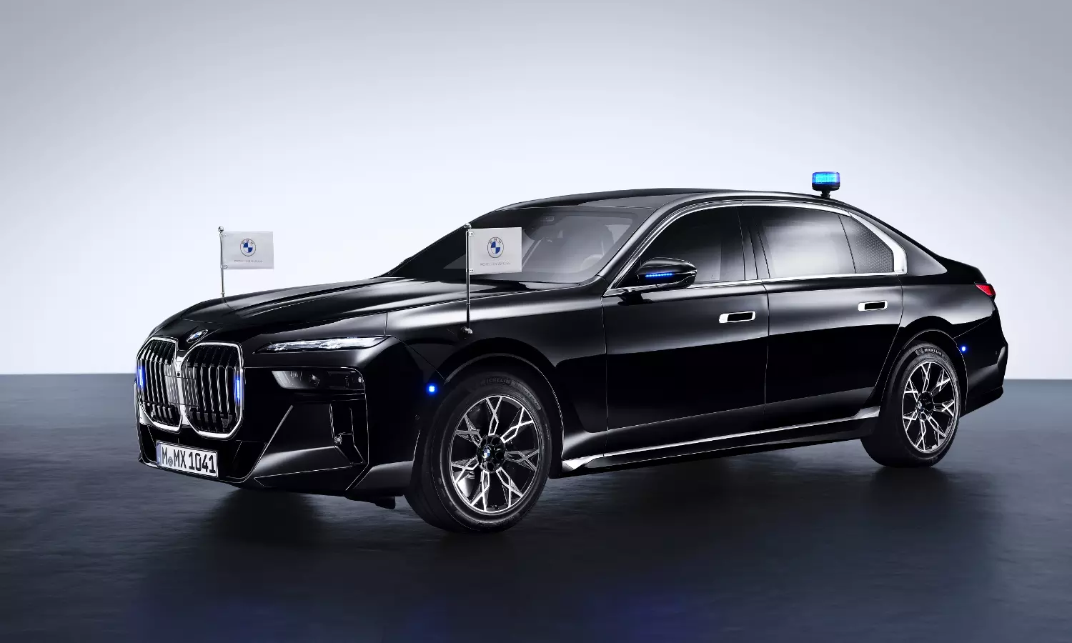 Other protection features include run-flat tyres, specially made by Michelin which allow the car to be driven 30 km at 80 km/h without losing air pressure, rear-wheel steering, fresh-air supply system, fire extinguisher with both automatic and manual discharge, flashing light, radio transceivers and flag poles.