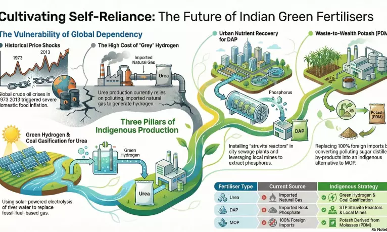 India imports the entire Muriate of Potash. However, Potash Derived from Molasses (PDM) is a waste-to-wealth initiative that converts a highly polluting liquid by-product of sugar distilleries into a valuable agricultural nutrient. It provides an indigenous alternative to imported Muriate of Potash (MOP), which could end India's dependency on foreign potash. To encourage its production, the central government has included PDM under the Nutrient-Based Subsidy (NBS) scheme.