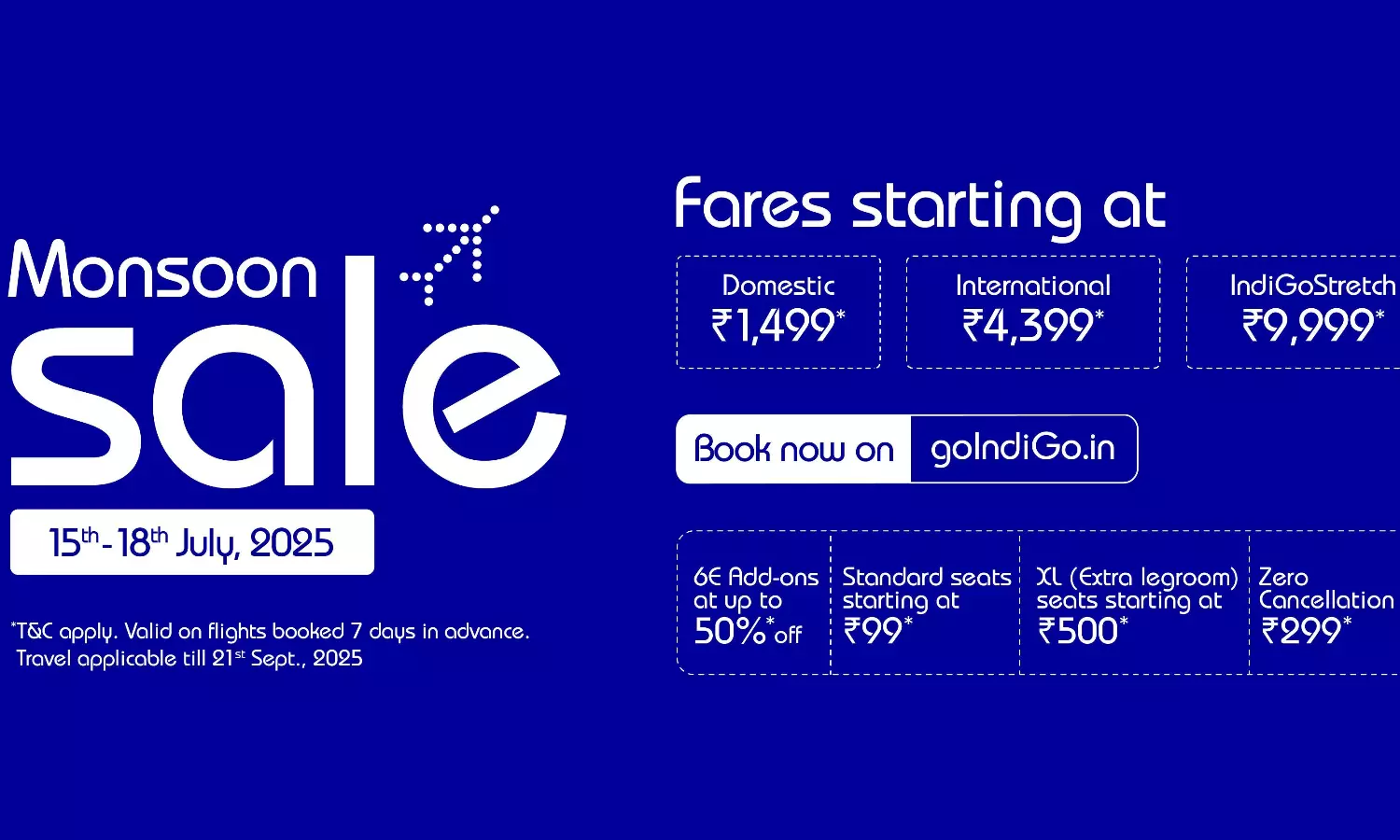 IndiGo, India’s preferred airline, today announced its second "Monsoon Sale" this season, offering affordable fares with value-packed add-on offers for its customers. Under the sale, IndiGo is offering all-inclusive domestic fares starting from ₹1,499, and international fares from ₹4,399. Customers seeking added comfort have the option to travel IndiGo’s tailor-made business product - IndiGoStretch, starting at just ₹9,999. Bookings, under the sale, are open from July 15, 2025 to July 18, 2025 for travel between July 22, 2025 and September 21, 2025. To avail these fares, bookings must be made at least seven days prior to the travel date.