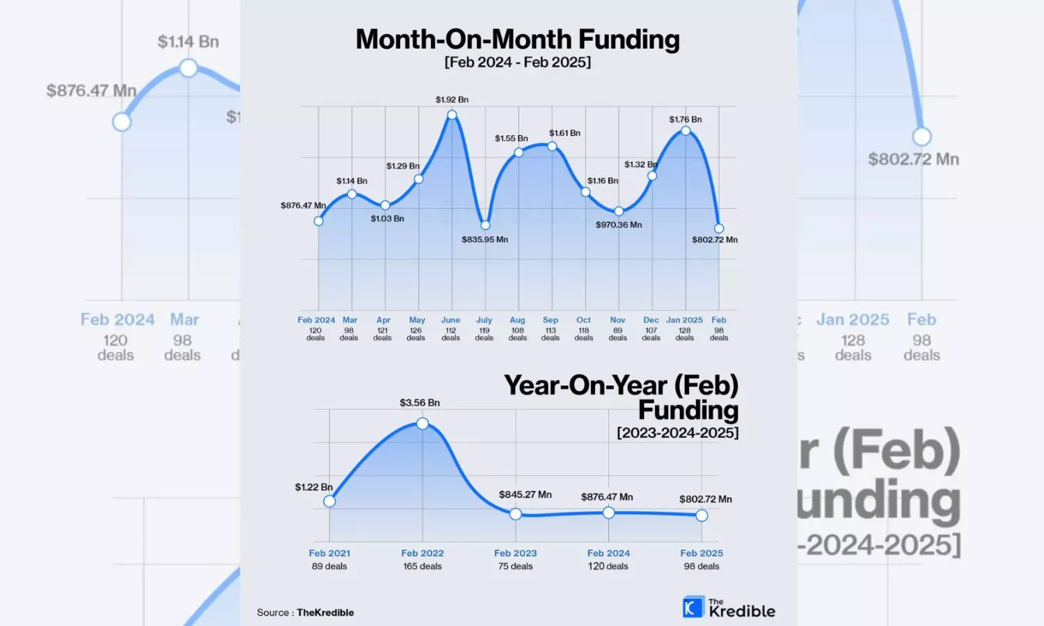 Indian startups raised $802M in February, a 54% drop from January, with fintech leading. Market sentiment affects large deals and IPOs