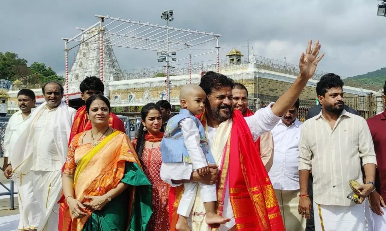 Accompanied by his wife Geetha, daughter Nymisha Reddy, grandson, and other family members, Revanth Reddy had darshan at the hill shrine in what was his first visit to Tirumala after assuming office in December last year.