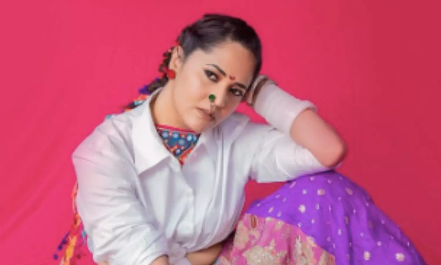 Anasuya Bharadwaj dons a multi-hued skirt paired with a crisp white blouse tied at the waist. Traditional fashion looks perfect on her! Holding a decorative fan against a bold pink backdrop in one of her latest stills, she nails it.