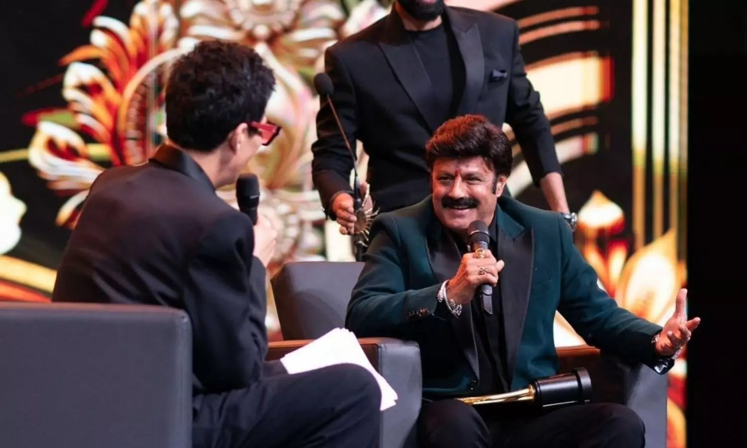 Nandamuri Balakrishna was won the hearts of the audience with his straight forward talk. After he received the legacy award, Karan Johar asked if he could pose a few questions to him. Balayya sat down for a chit chat with KJO, who put a disclaimer saying, “I have been prompted by Rana to ask these questions. So anything goes wrong, please ask him.”