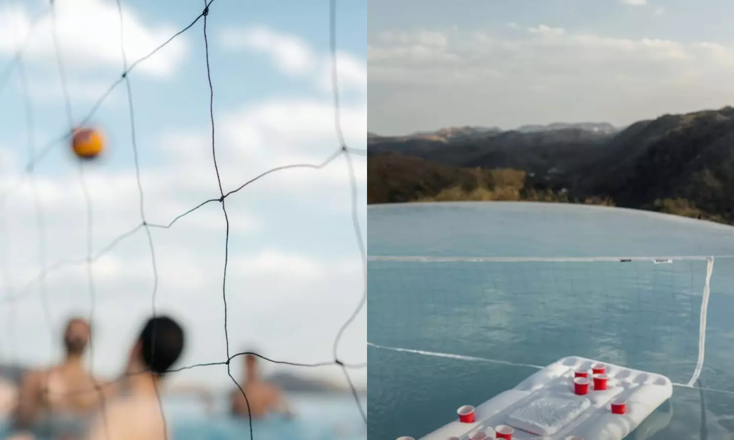 Vijay posted a shot focused through a volleyball net with players silhouetted in the water and a ball in mid-air, hinting at a playful match in full swing. Another frame showed a floating drink station complete with red cups and a panoramic landscape beyond the pool, capturing the laid-back celebration vibe ahead of The Wedding of VIROSH.