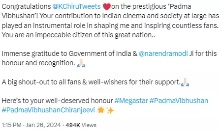 Ram Charan, visibly proud of his father's achievement, chose Twitter as the platform to extend his congratulations. In a tweet, he expressed, “Congratulations @KChiruTweets ❤️on the prestigious ‘Padma Vibhushan’! Your contribution to Indian cinema and society at large has played an instrumental role in shaping me and inspiring countless fans. You are an impeccable citizen of this great nation..