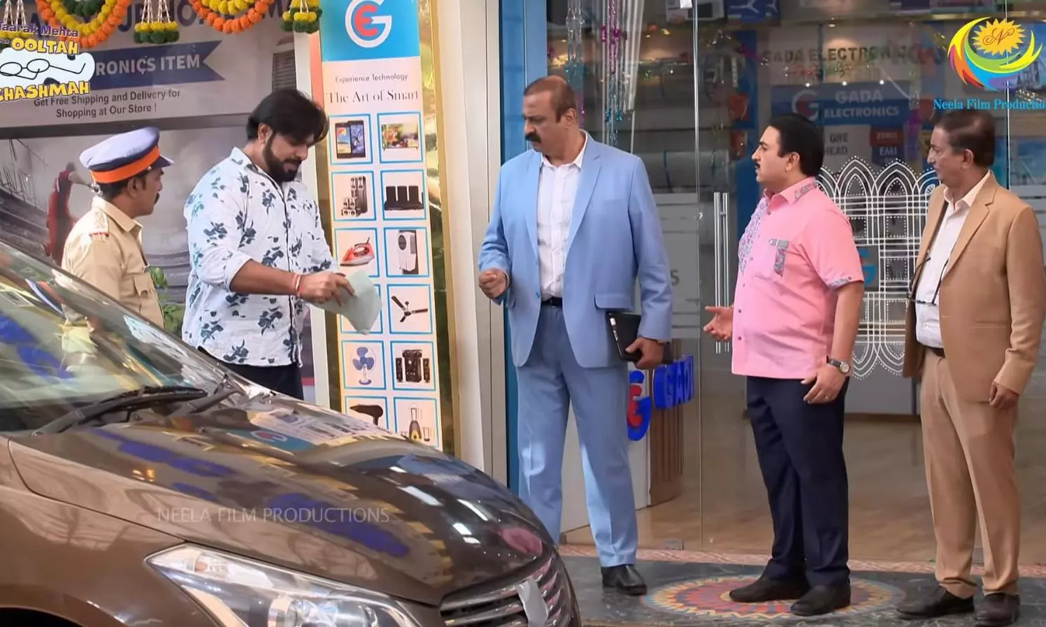 Just as Mr. Venukutti steps into Gada Electronics for his inspection, chaos erupts! A stranger storms in with police officials, claiming that the car sent to pick up Mr. Venukutti from the airport belongs to him and was stolen! The police take the claim seriously, and all eyes turn to Bagha, who was driving the car. A nervous Bagha stammers for an explanation, but in his panic, he calls out to Jethalal for help, referring to him as "Sethji." This unexpected moment leaves Mr. Venukutti surprised and suspicious!