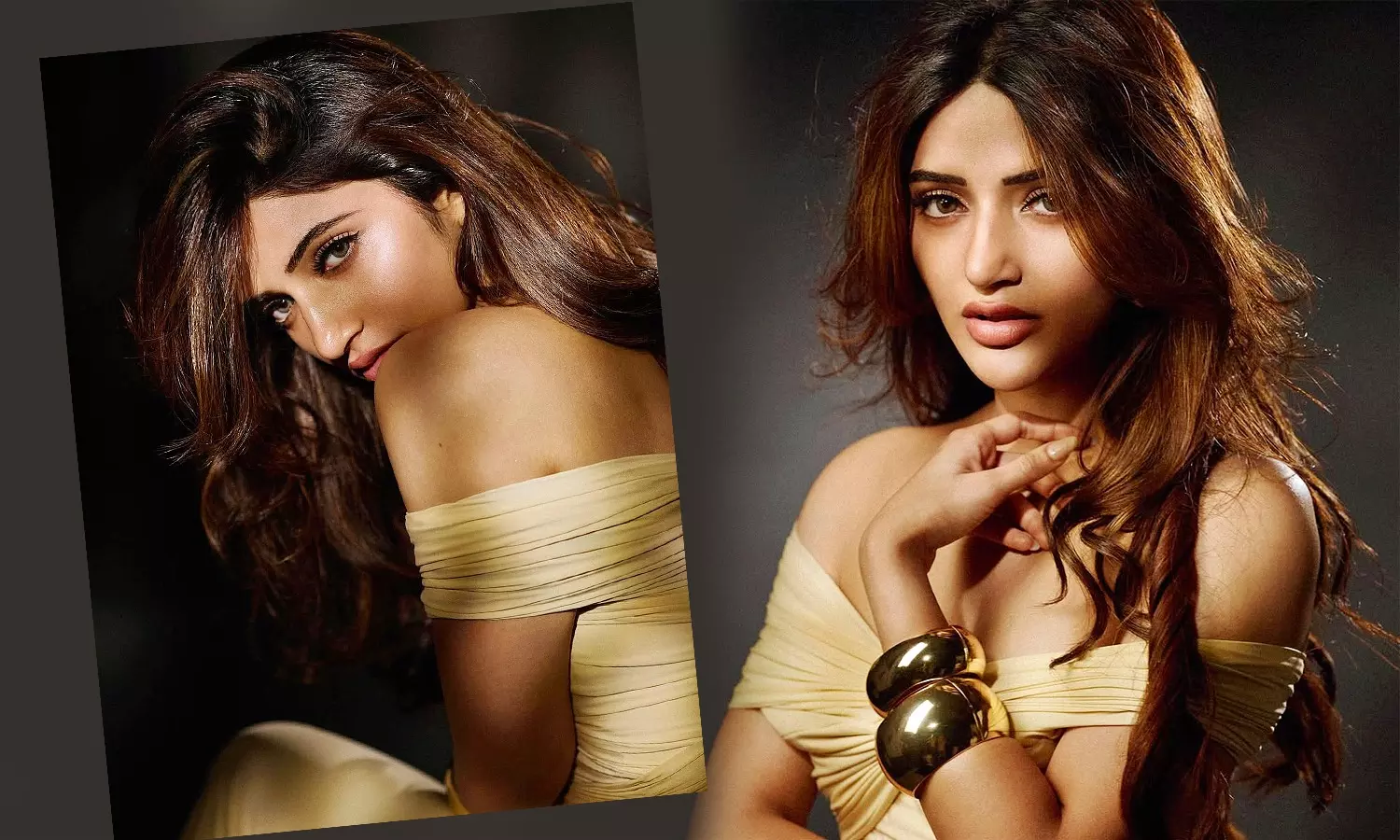 Sreeleela is striking in an off-shoulder, light golden dress.