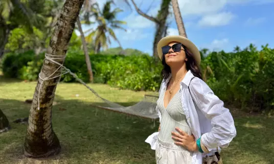 Actress Ritu Varma basks in a serene tropical setting, lounging gracefully in a hammock amidst lush greenery. Dressed in a stylish striped top, light trousers, and a chic white hat, she looks tranquil.
