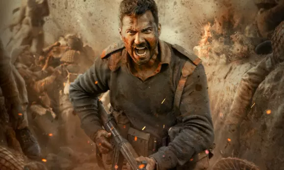 In the poster, the actor can be seen in a battlefield amongst chaos wielding a rifle and dressed in military attire.