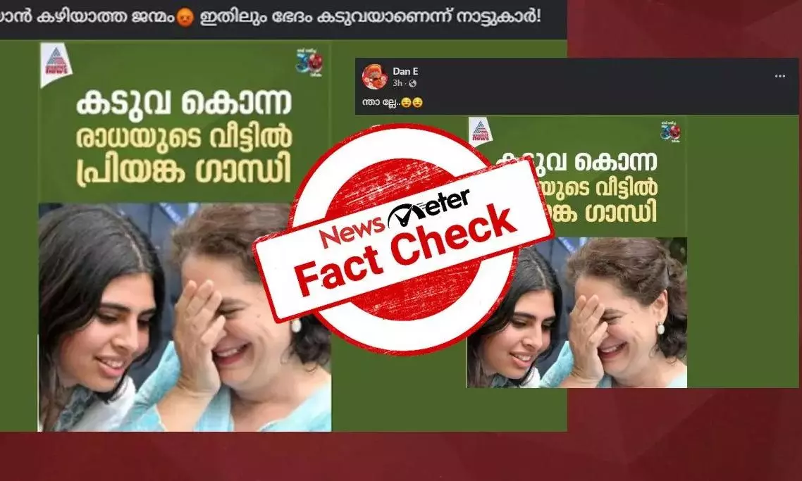 A news card featuring Priyanka Gandhi, supposedly from Asianet News, has been circulating on social media. The card claims that Priyanka visited the house of Radha, a woman killed in a tiger attack in Wayanad, and was seen smiling in the image.