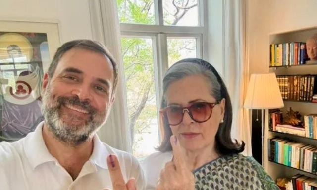 Claim: In the 6th phase of the Lok Sabha elections on May 25, Congress Leader Rahul Gandhi with mother Sonia Gandhi cast their votes in Delhi. Following this, a selfie of the mother-son duo showing their inked fingers has gone viral on social media, with users claiming that the poster behind them depicts Jesus Christ.