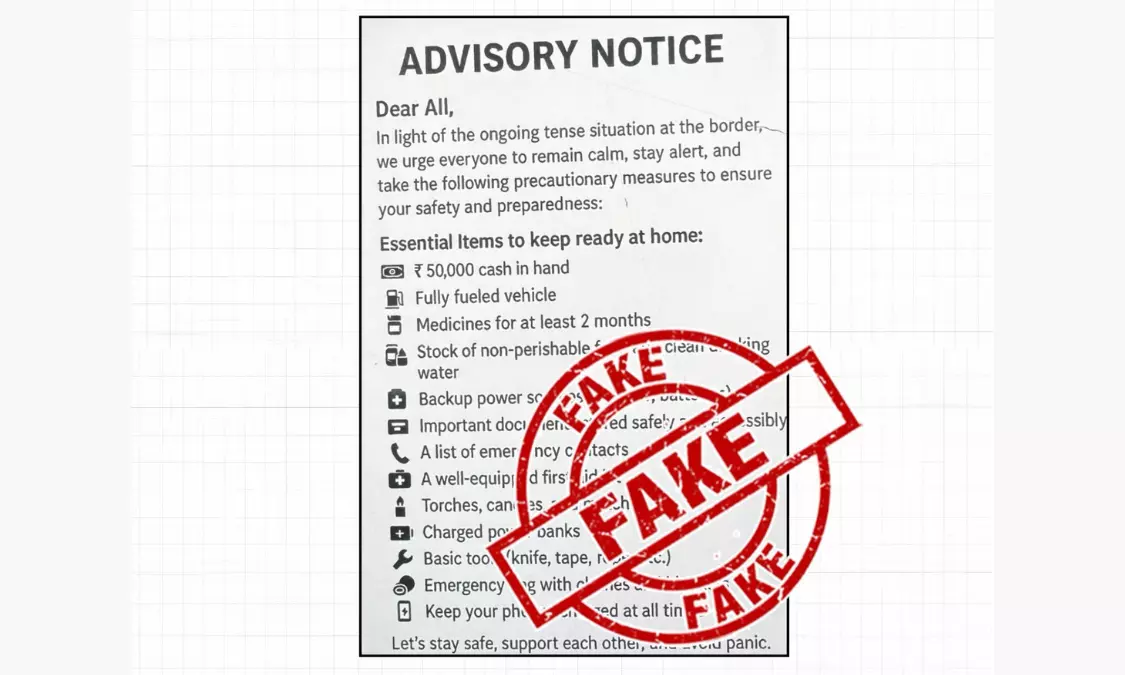 "An image of an advisory is being shared online, claiming that the Government has urged individuals to take precautionary measures and keep essential items ready at home. #PIBFactCheck ❌ This claim is #FAKE. The government has not issued any such advisory," PIB wrote in a post on X.