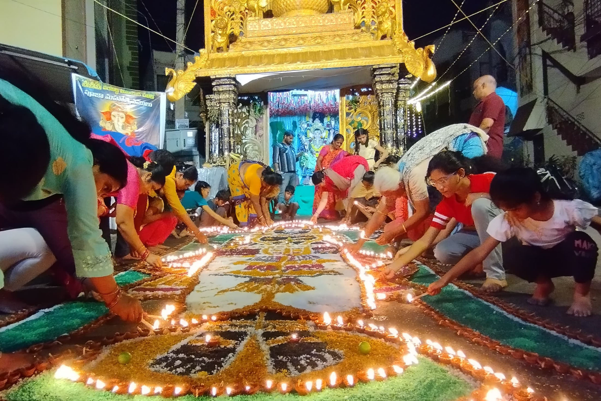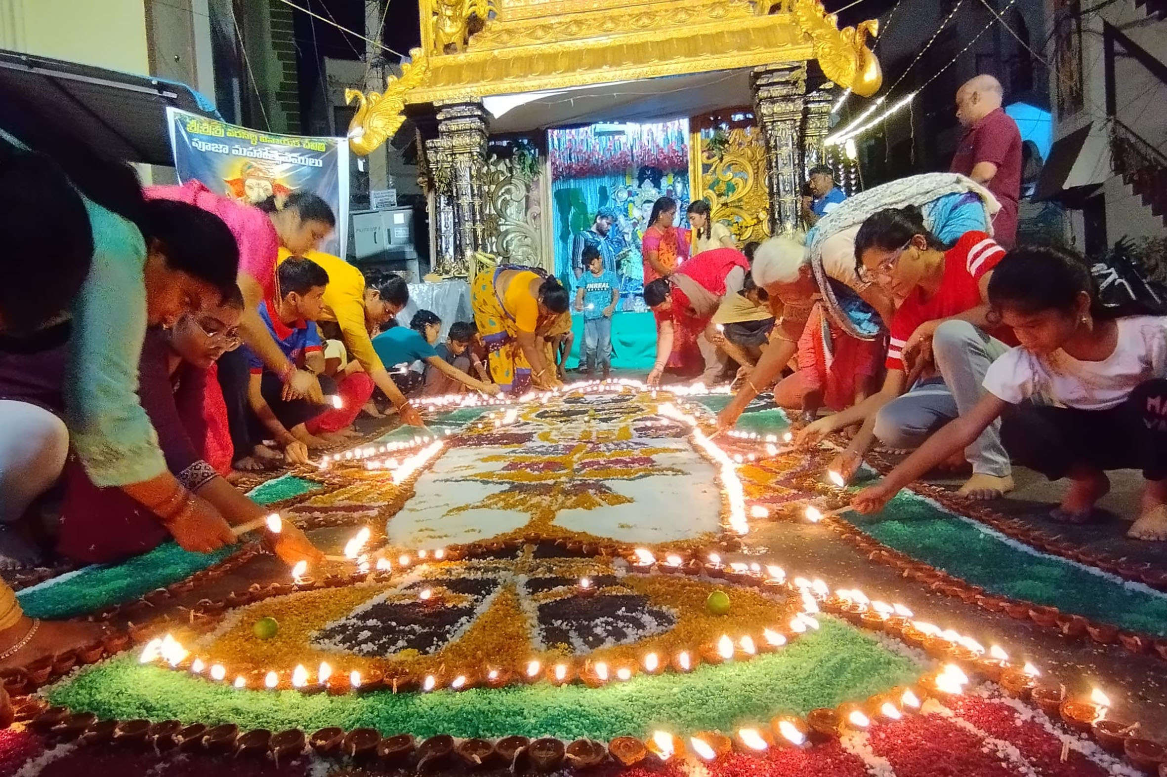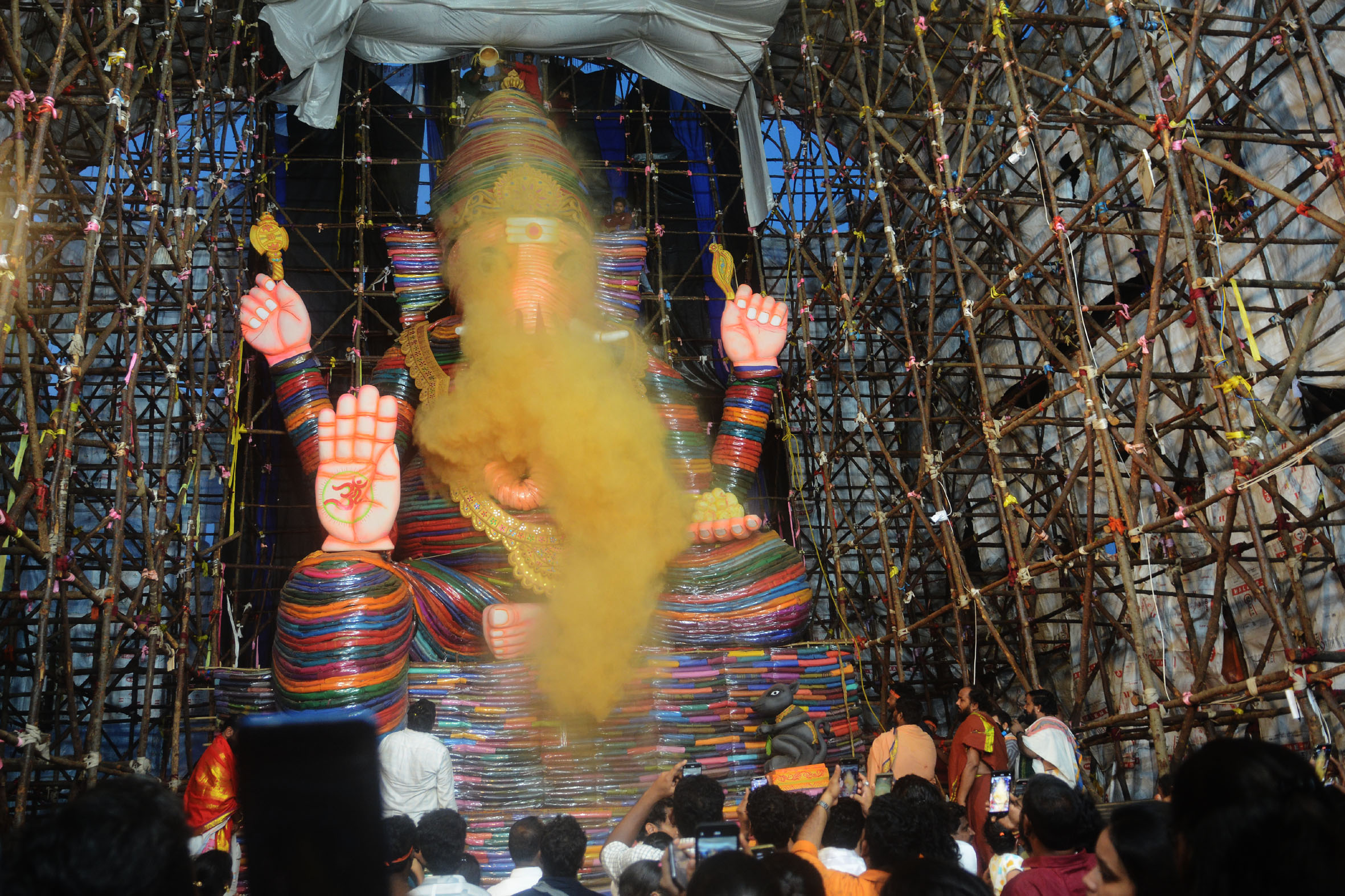 Visakhapatnam: A Ganesh idol made from one lakh sarees is prepared for immersion with flowers and turmeric at Gajuwaka Lanka Grounds in Visakhapatnam.