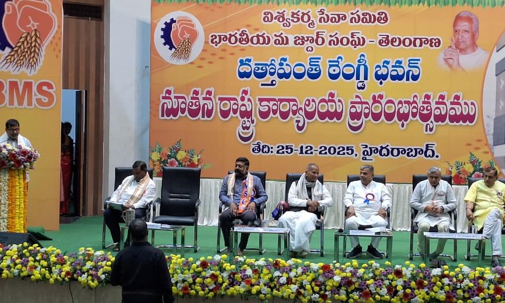 RSS akhil Bharatiya karyakarini member Bhagayya likened the new building to a home built through workers' sweat and savings, without relying on government funds. BMS organisation secretary Surendran noted the role of 5,836 affiliated unions and Telugu states' role in past membership drives. BMS president Hiramayi Pandya called the office inspirational, boosting activists' responsibilities.