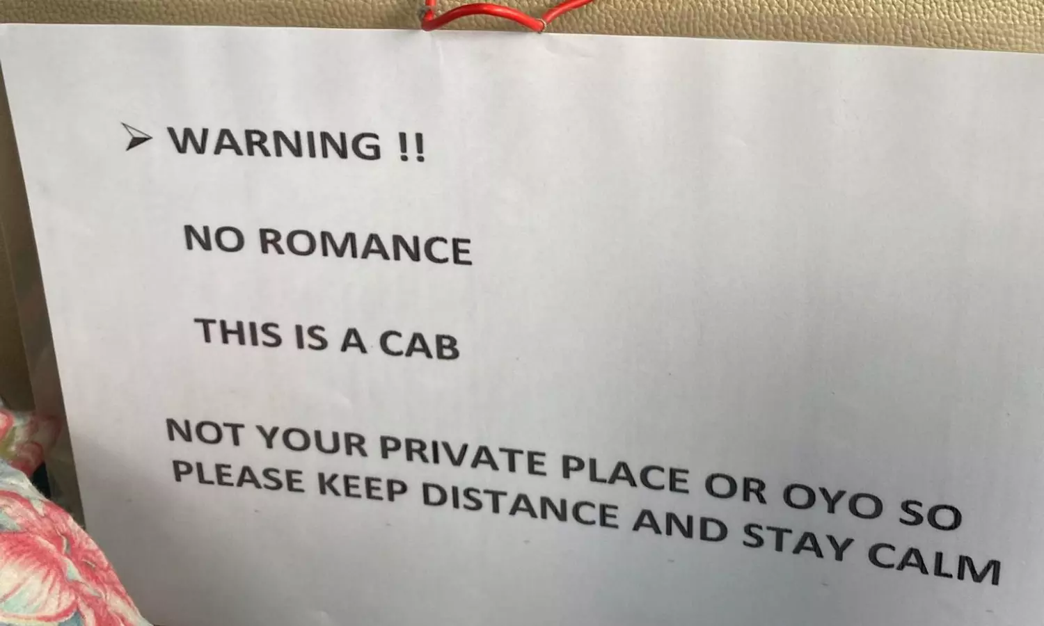 Hyderabad: A notice, warning passengers against indecent behaviour, displayed inside what seems to be a taxi cab in Hyderabad has gone viral on social media. The notice reads: "WARNING!! NO ROMANCE THIS IS A CAB NOT YOUR PRIVATE PLACE OR OYO SO PLEASE KEEP DISTANCE AND STAY CALM."
