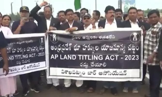 Visakhapatnam: Lawyers in Visakhapatnam staged a protest on Sunday along Beach Road, opposing the Andhra Pradesh government’s enactment of the Land Titling Act 2022. The protest was organised by the Visakhapatnam Bar Association and stretched from RK Beach to the YMCA.