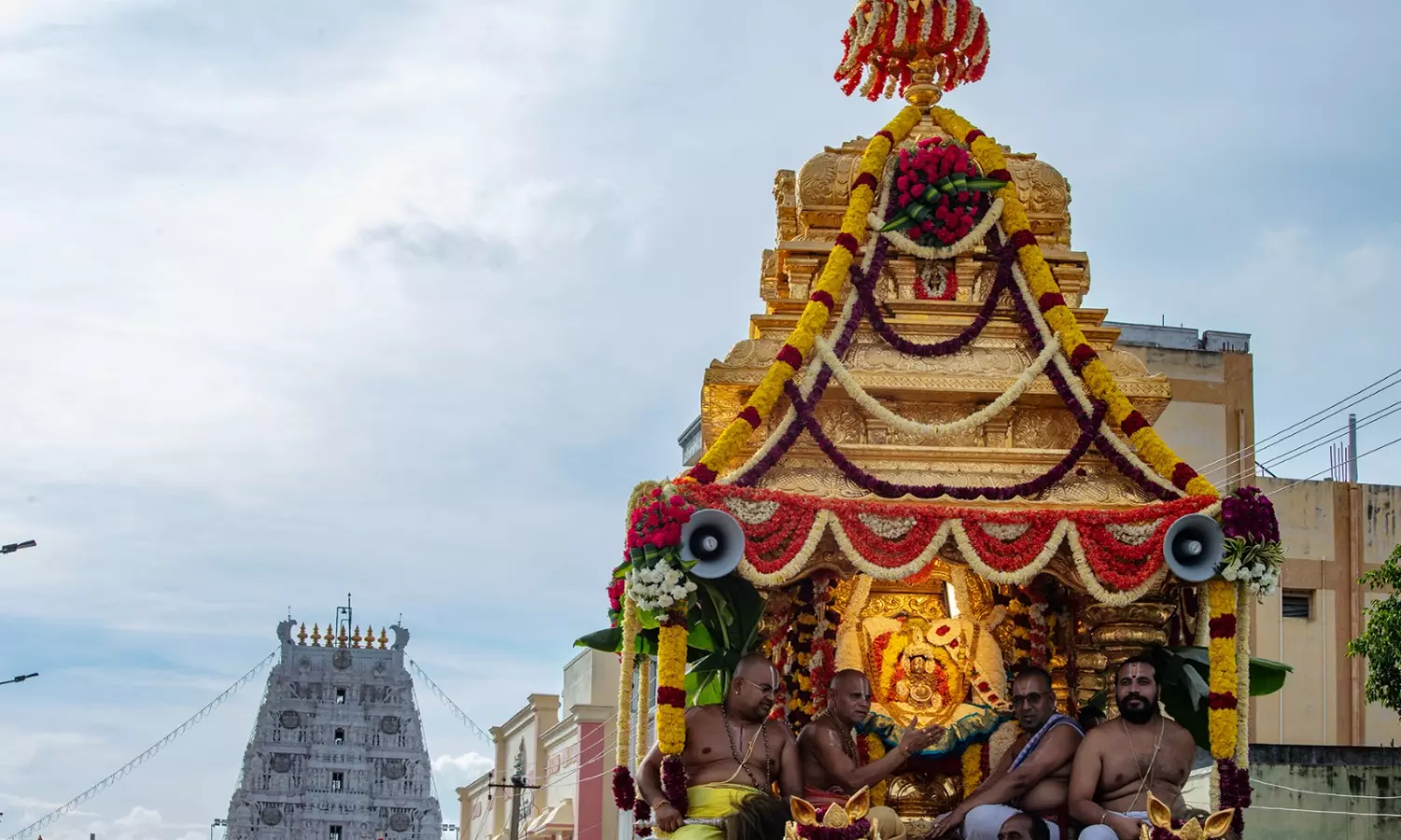 The festivities commenced in the early hours of the day as the chariot began its majestic procession around the four mada streets surrounding the temple premises. Devotees thronged the streets, eagerly awaiting glimpses of the divine idols as the chariot moved along Karnala Veedhi, Beri Veedhi, and Gandhi Road.