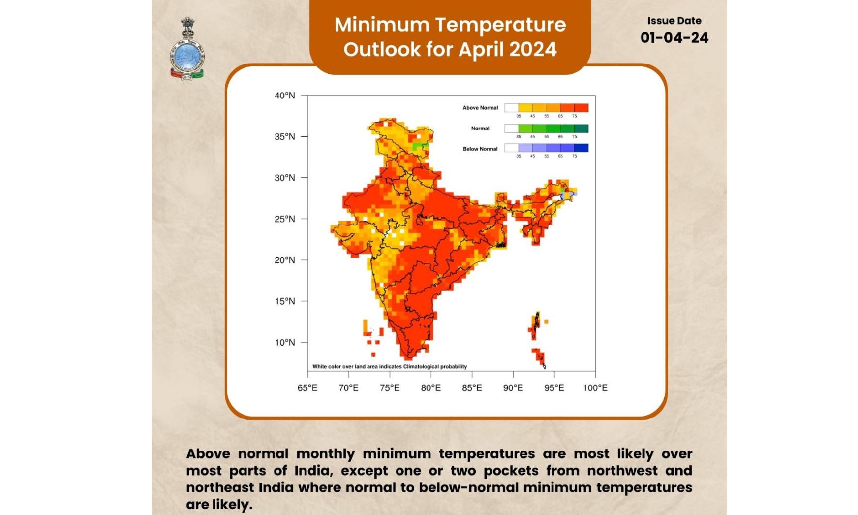 The IMD, for the April forecast released on Monday, said there was a 45 to 75 per cent probability of above normal temperatures in Telangana state, as well as rest of the country except isolated pockets of northeast and northwest India. Similarly, there was a 55 to more than 75 per cent probability of higher than normal minimum temperatures in the state, it said.