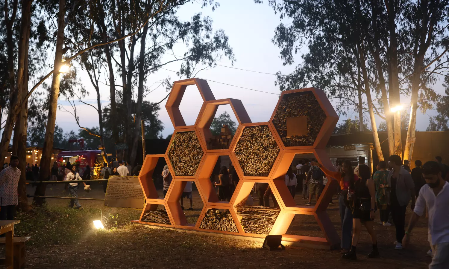 Creating an immersive and engaging experience for festival-goers posed several challenges, including tight timelines and the large size of the installation. I travelled from Pune to Bangalore for this installation set-up. Sourcing the right materials was particularly difficult, as bees are very selective about artificial materials. To overcome these challenges, we meticulously planned each step and collaborated with the Echoes of Earth team to ensure local suppliers’ timely delivery of eco-friendly materials like bamboo, sticks, wood logs, and mud. Additionally, I engaged volunteers to help with the construction, ensuring the installation stayed on schedule. By focusing on natural materials and involving the community, I was able to create an installation that was both functional and visually appealing, enhancing the festival experience.