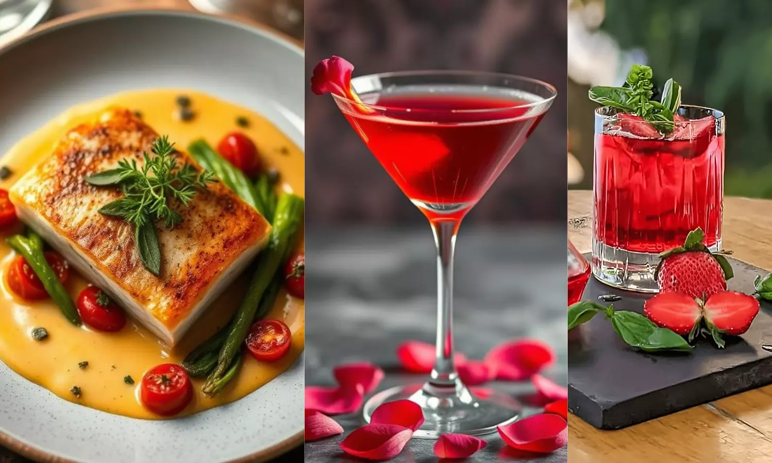Wild Sea Bass with Broccolini, Confit Cherry Tomato, Butternut Purée, and Champagne and Seaweed Cream Sauce by Chef Nesamani Adaikkalam, Executive Sous Chef at Conrad Bengaluru while drinks - Scarlet Affair and Cupid’s Cosmo by Ajeet Kumar, Restaurant Manager at Conrad Bengaluru