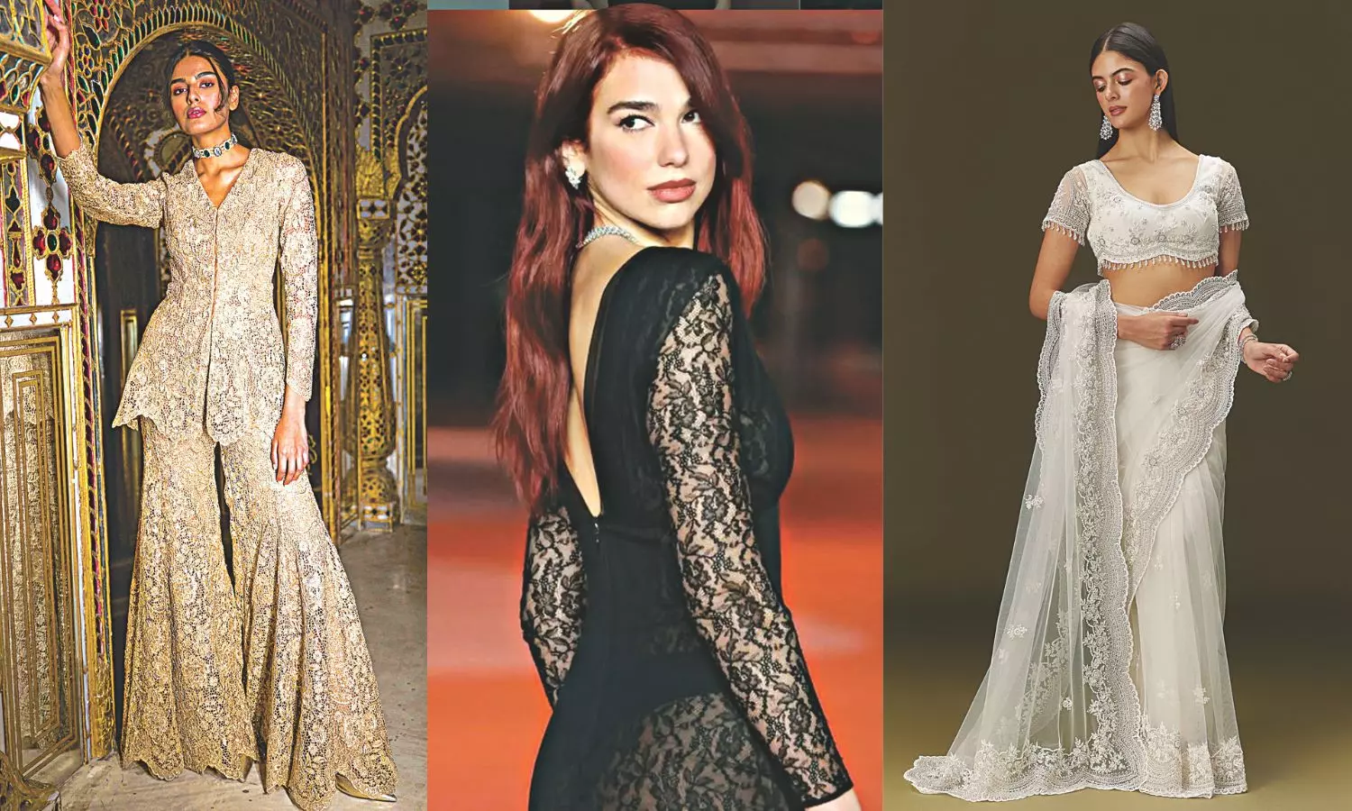 Lace is used as a glamorous statement rather than an accent; lace co-ords, skirts, and dresses mix nostalgia with modernity. Lace pairs with Indian silhouettes like Shararas or kurta sets, but is relevant in global styles like cropped shirts or denim. That duality — the ability to move between cultures and occasions is what keeps lace in demand today.” says Gujral.
