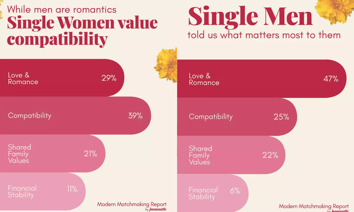 According to the survey, 47% of men prioritize love and romance while choosing a partner, compared to 29% of women. Instead, 39% of women prioritize compatibility, while only 11% cite financial stability as a key factor while choosing a partner. Regional differences also emerged, with singles in Delhi and Mumbai valuing romance, whereas those in Bangalore emphasized compatibility.