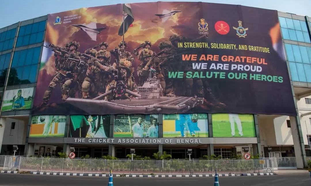In a patriotic gesture, the Cricket Association of Bengal (CAB) on Monday enveloped the facade of Eden Gardens stadium on the Clubhouse end with a huge banner in support of the Indian armed forces after it's military operations in Pakistan.