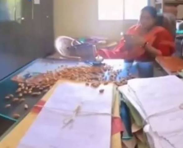 In the video, the youth, identified as Toran Sahoo, was seen barging into the official chamber of assistant manager of the Bilaspur branch of the board Poonam Banjare and then spilling a bag of groundnuts on her table, leaving her puzzled and stunned.