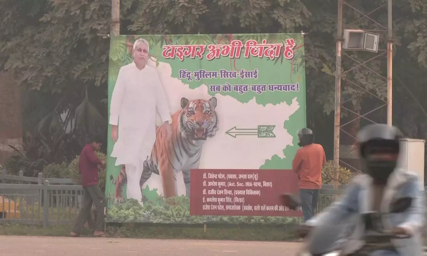 Patna: As the Janata Dal (United) gears up for a verdict in the Bihar Assembly elections, a poster dedicated to Chief Minister Nitish Kumar with the title of a 'Tiger who still has the power (Tiger Abhi Zinda Hai)' was seen outside the CM's residence at 1 Anne Marg in Patna.