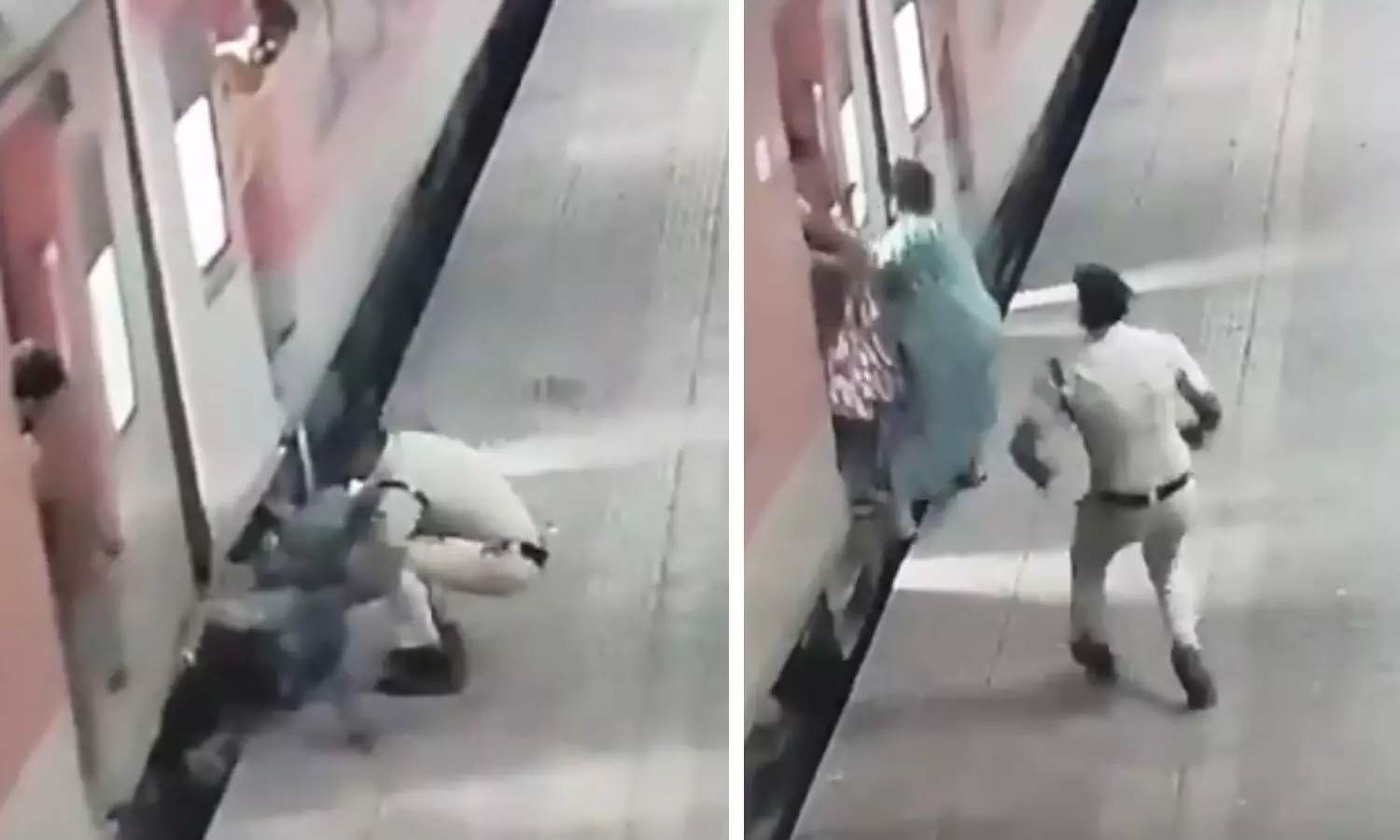 Alert railway cop saves woman from falling into the gap after she slips while alighting