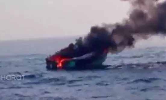 Visakhapatnam: A mechanized boat went up in flames after a cooking gas cylinder exploded in mid-sea at about 65 nautical miles off Visakhapatnam coast on Thursday night. All the nine fishermen sustained burn injuries and of them five sustained serious burns.