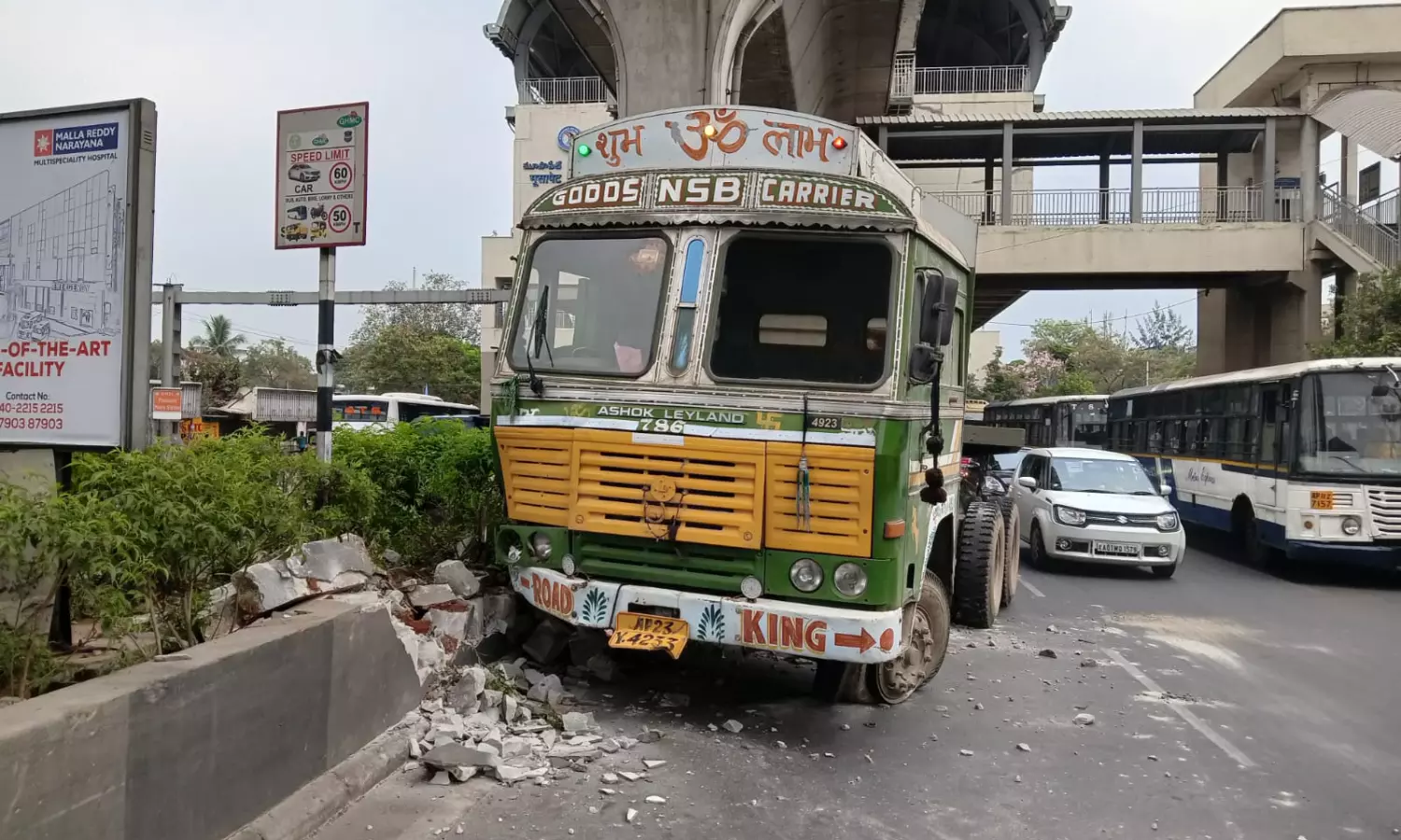 Hyderabad: A trailer lorry went out of control and rammed into the divider near the Kukatpally Metro Rail station, causing a huge traffic jam during the morning rush hour on the arterial road leading to the IT zone, on Tuesday.