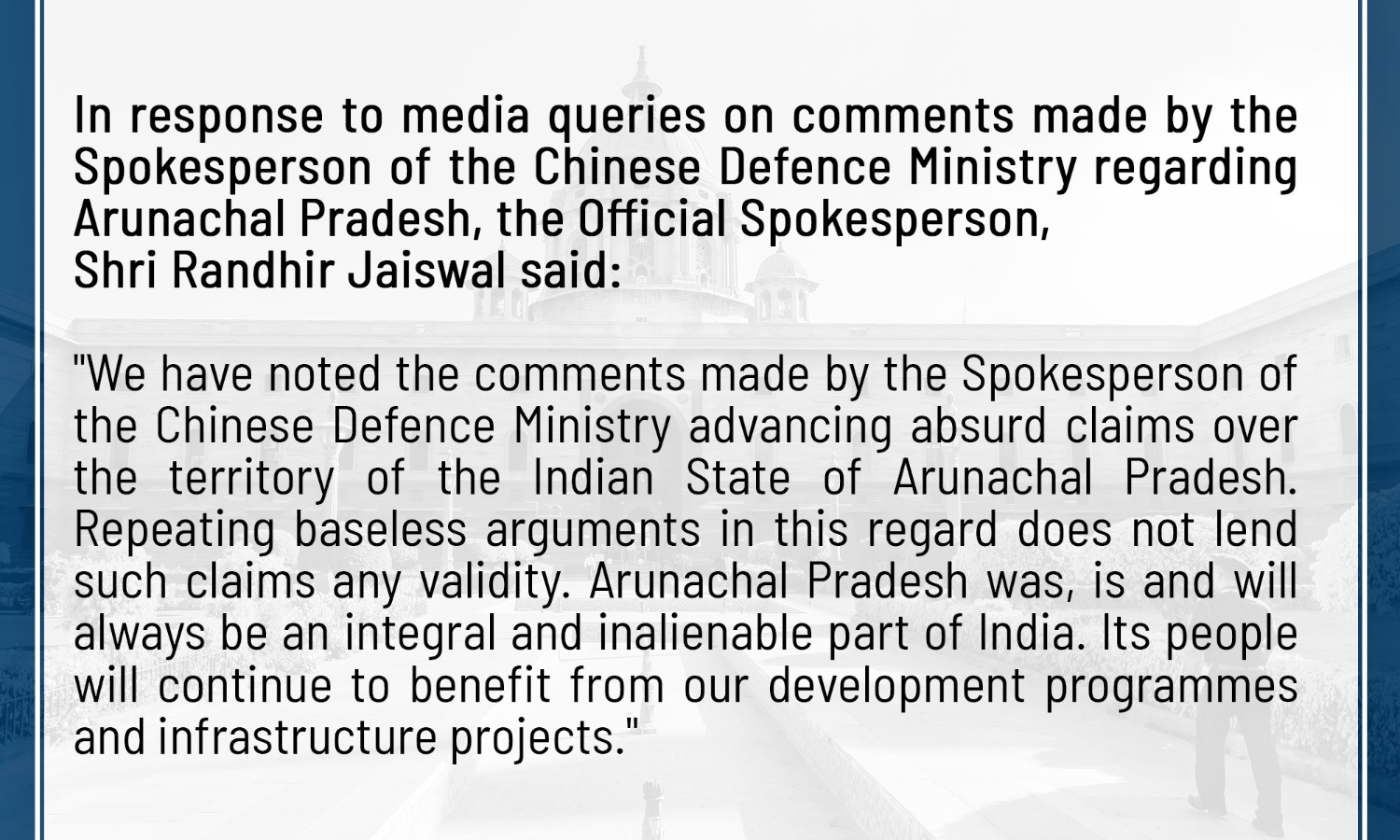 The MEA statement said that it was in response to media queries on comments made by the spokesperson of the Chinese Defence Ministry regarding Arunachal Pradesh.