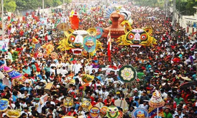 Berhampore: Bengali new year is going to be celebrated in historic Murshidabad district in various ways. Mongal shova yatra ( people 's welfare march) will be observed on the early morning of Poila Baishakh at Berhampore where various socio cultural groups, group theatre troupes, traditonal folk dances troupes, traditional drum beaters,students, teachers and people of various walks of life will took part in this welfare march to maintain peace and communal harmony and will march thoroughfare of Berhampore to celebrate the first day of Baishakh, informed one of the organiser Ashis Bagchi. Various people bathe in a holy dip in the river Ganga to observe the 1st day of Baishakh followed by pujas in various temples specialy Vishnupur Kali temple.