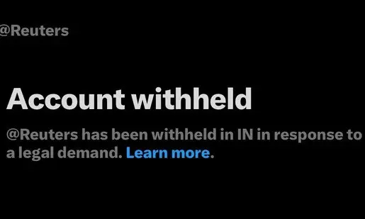 X users attempting to access the main account can see a message that reads: "Account withheld. @ Reuters has been withheld in IN in response to a legal demand."