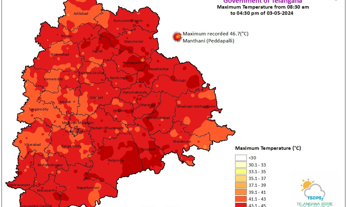 According to Telangana Weatherman, the state will have a very humid heatwave, during the two days from May 4 to 6. The temperature will remain 46-47 degree Celsisus in rural Telangana and 44 degree Celsius in Hyderabad. There are chances for scattered storms in East Telangana on Friday evening. Dry weather will prevail in other parts of the state.