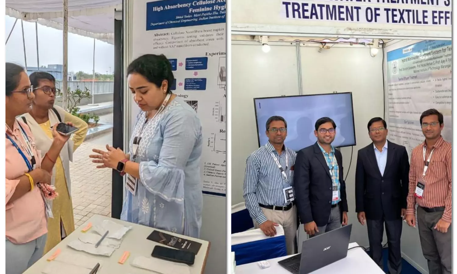 From NIT Warangal, a breakthrough hybrid wastewater treatment system for textile effluents was presented. Developed in collaboration with the textile industry, the system utilised cavitation, biosurfactant, and membrane technology for efficient and eco-friendly treatment. The team consisting of student M. Surya Teja and Professors Shirish H. Sonawane, Murali Mohan, and Ajay Patel talked at length about the need for economical and effective ways to treat such effluents which are now patented and will soon be used by textile industries for sustainable wastewater treatment approach.