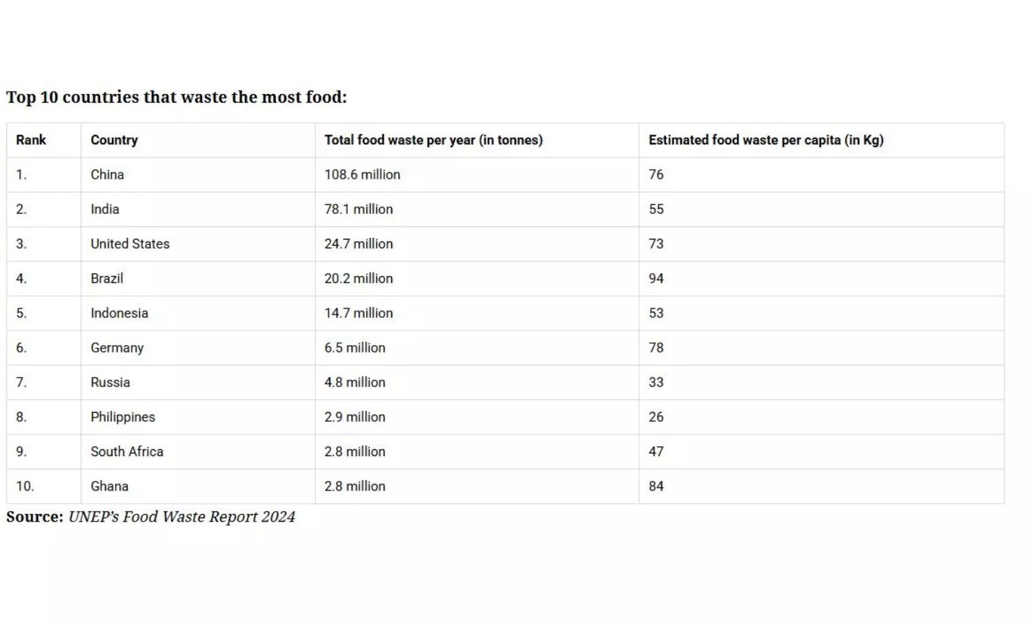 The UNEP's Food Waste Report 2024 puts China and India at the top of the list wasting 108.6 million tonne and 78.1 million tonne respectively in that year. The huge population in both countries leads to that huge wastage. The US also wastes a huge amount, about 24.7 million tonnes each year and stands in the third position. In Europe, nations like France and Germany throw away between 3.9 and 6.5 million tonne each year. Meanwhile, countries such as South Africa and Ghana waste over 2.8 million tonne annually.