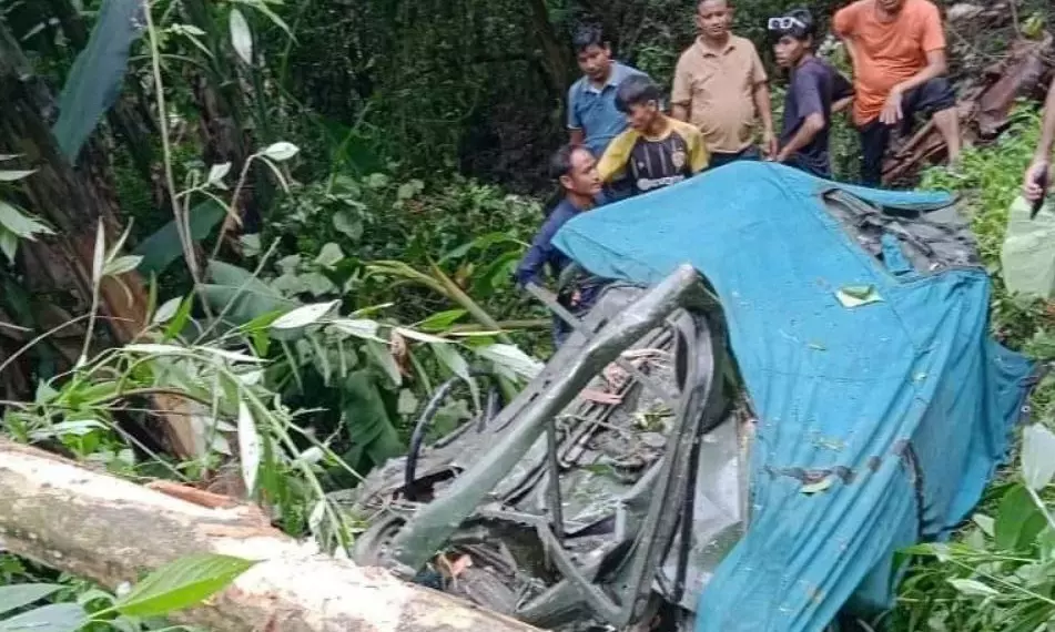 The vehicle carrying Army's EMC personnel stationed at Binnaguri, West Bengal skidded off the road at Vertical Bhir along the Rhenock-Rongli highway and fell into a forest down below, they said.