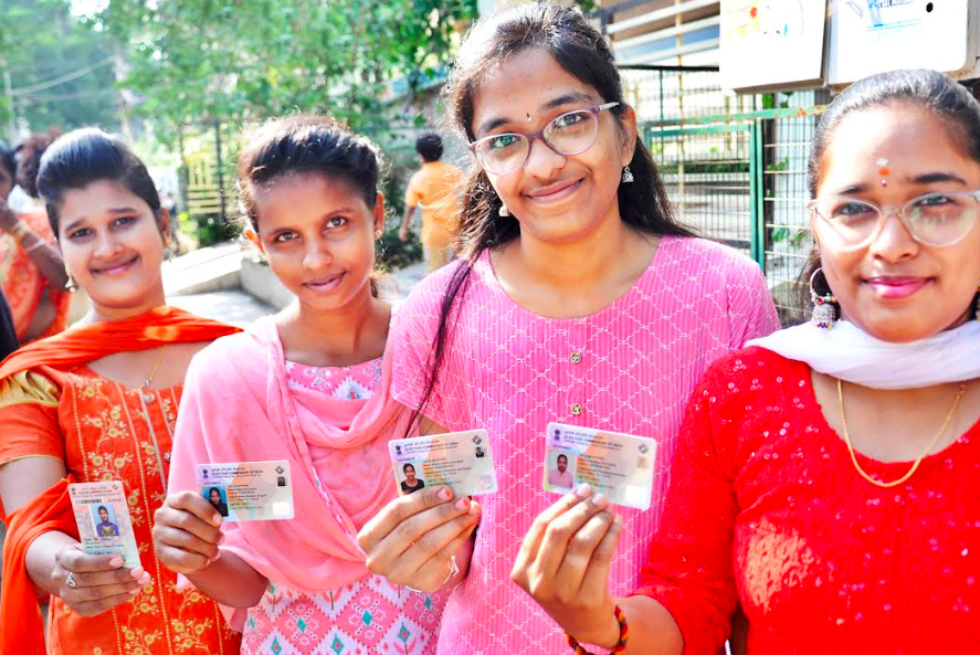First time voters show their Id cards while waiting for their turn to cast their vote at Nagaraju Municipal school in Rajamahendravaram on Monday. - A.MANIKANTA KUMARFirst time voters show their Id cards while waiting for their turn to cast their vote at Nagaraju Municipal school in Rajamahendravaram on Monday. - A.MANIKANTA KUMAR