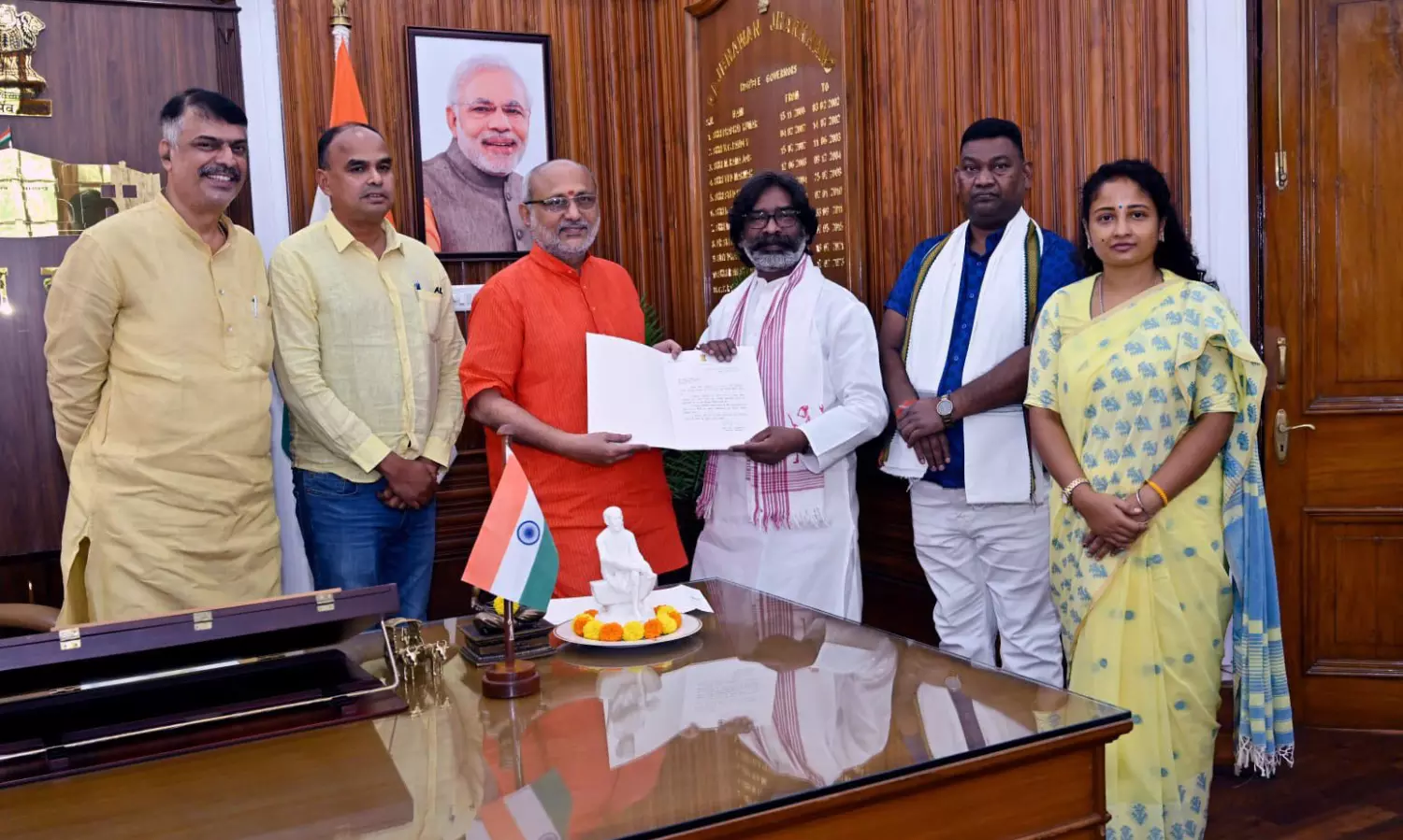 INDIA bloc leaders including JMM executive president Hemant Soren met Governor CP Radhakrishnan at Raj Bhavan, Ranchi on July 4. The Governor Thursday appointed Hemant Soren as the nominated Chief Minister and invited him to take the oath.
