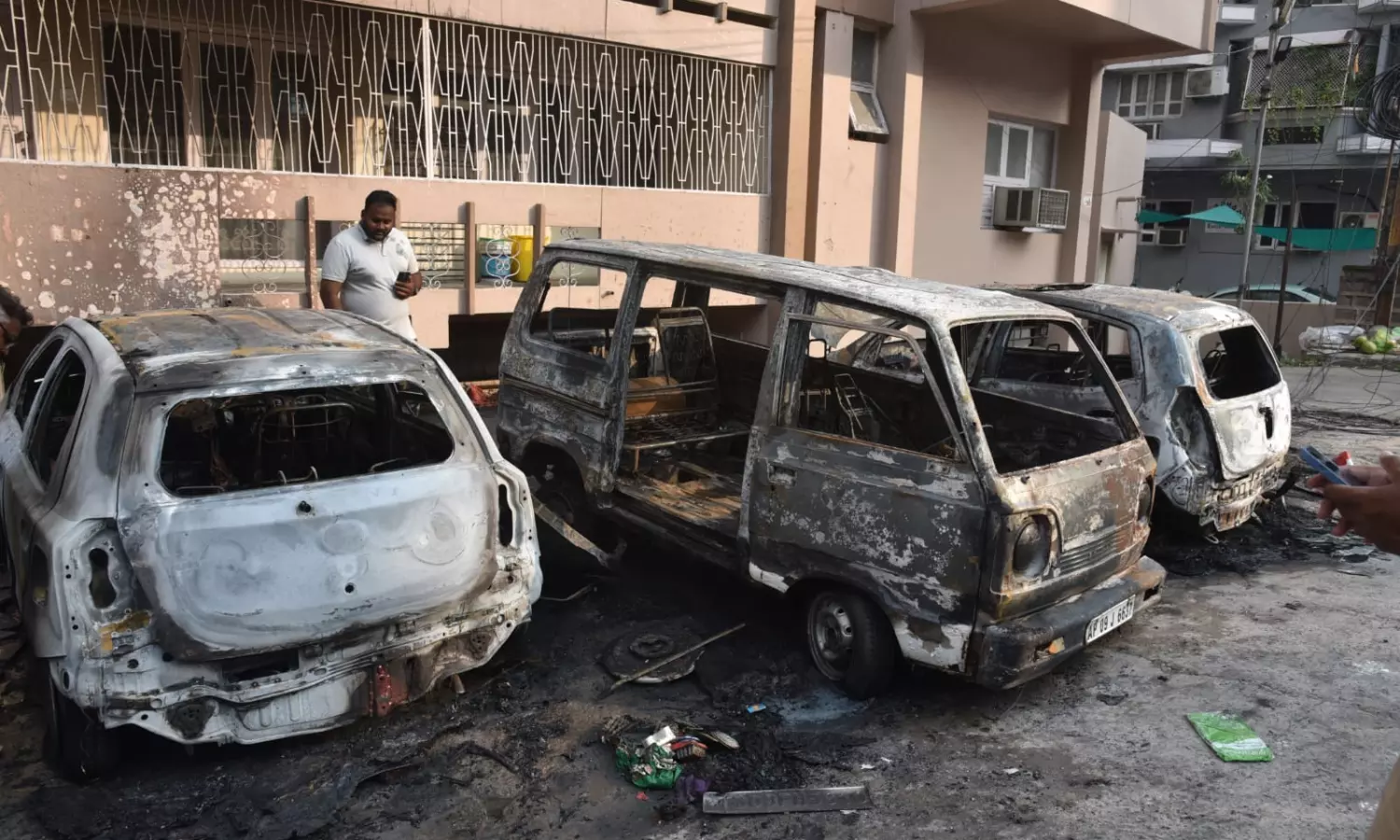 Police said that one of the cars that was parked in the centre of an unauthorised parking lot before Sarita Apartments caught fire and spread to other two cars parked beside it.