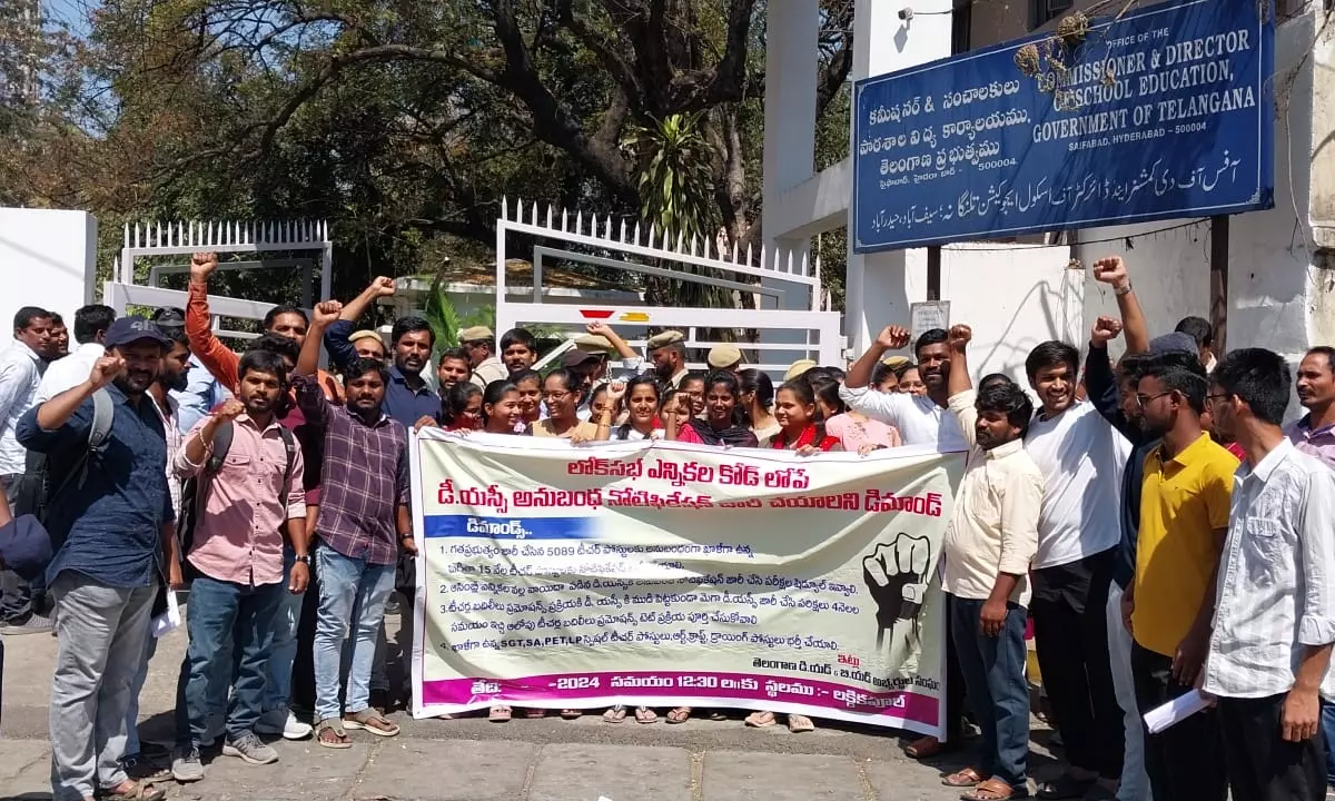 HYDERABAD: Aspiring teachers staged a protest outside the office of school education department on Friday, demanding the immediate release of the DSC (Departmental Service Commission) recruitment notification before the Lok Sabha election code of conduct would come into force.