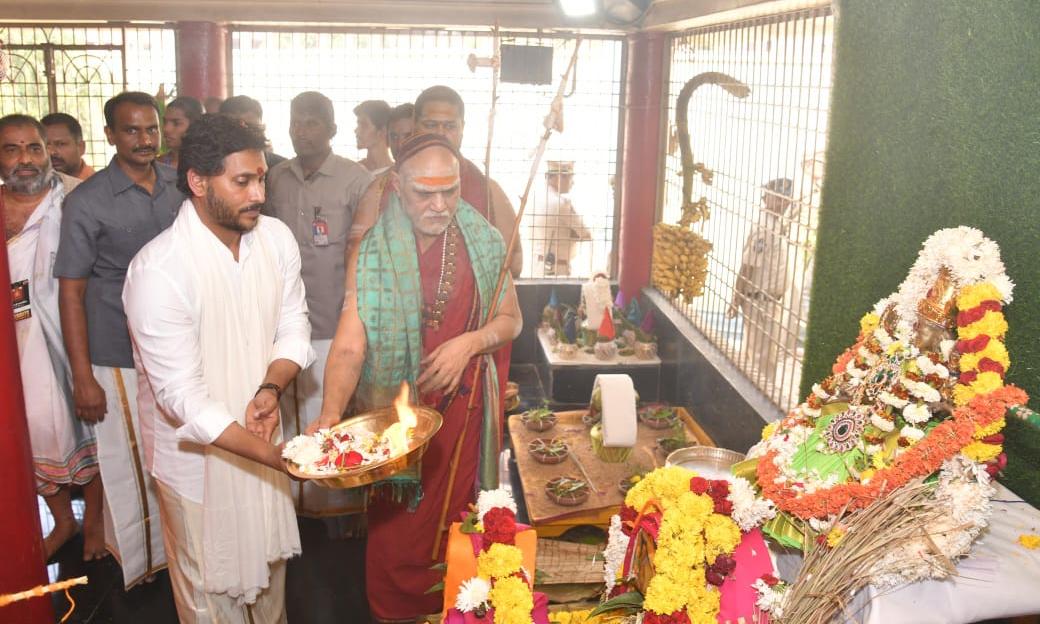 Sarada Peetham Uttaradhikari Swatmananda Saraswati welcomed the CM as per the temple customs. Jagan Mohan Reddy met Swami Swarupanandendra Saraswati and the two stood before the ceremonial idols of Goddess Sri Sharada Swaroop Raja Shyamala and then the Deeksha Peetham where the CM offered special puja.