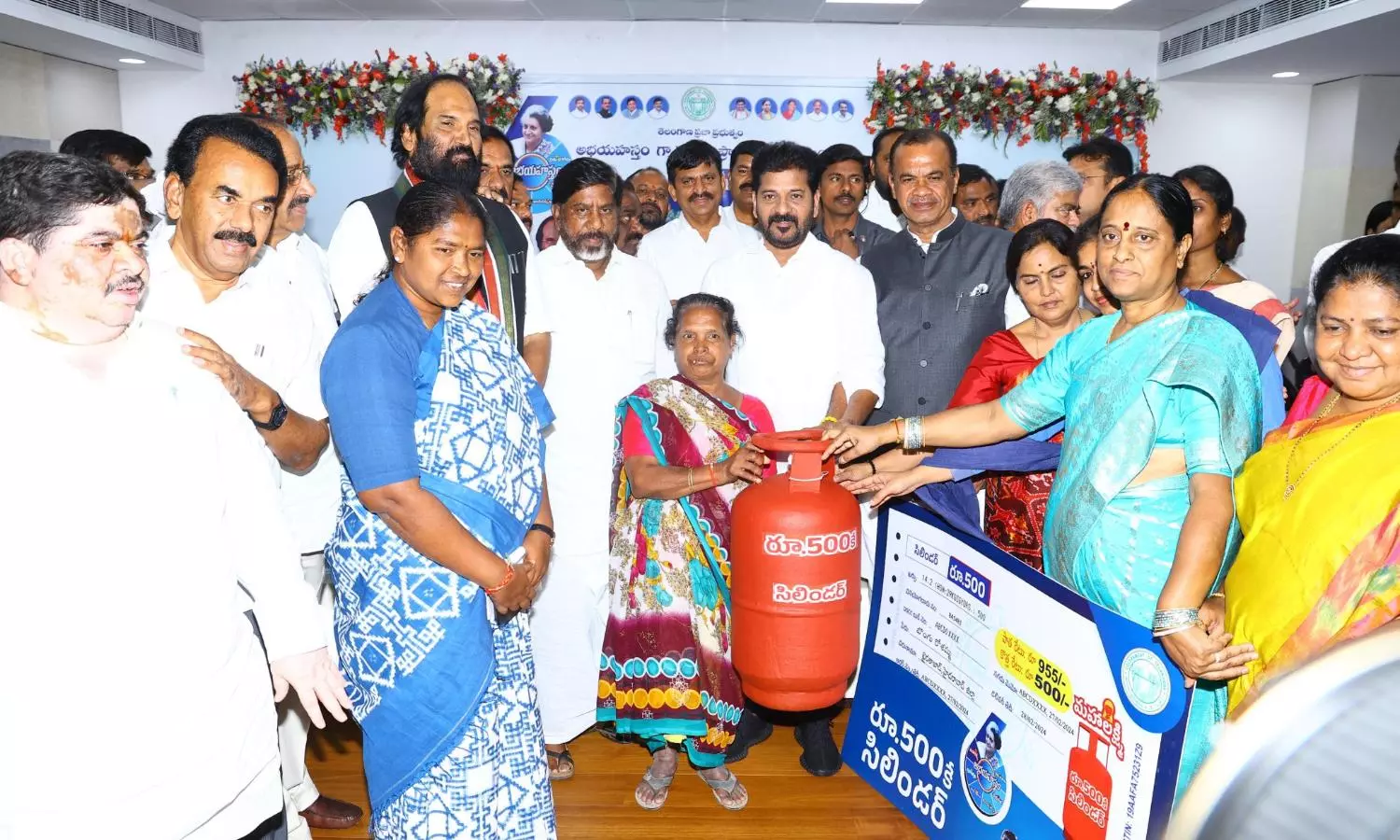 HYDERABAD: Chief Minister A. Revanth Reddy on Tuesday launched the LPG cylinder for Rs 500, under the Maha Lakshmi scheme, and free power up to 200 units, under the Gruha Jyothi scheme, fulfilling two more promises made by the Congress in the state polls run-up.